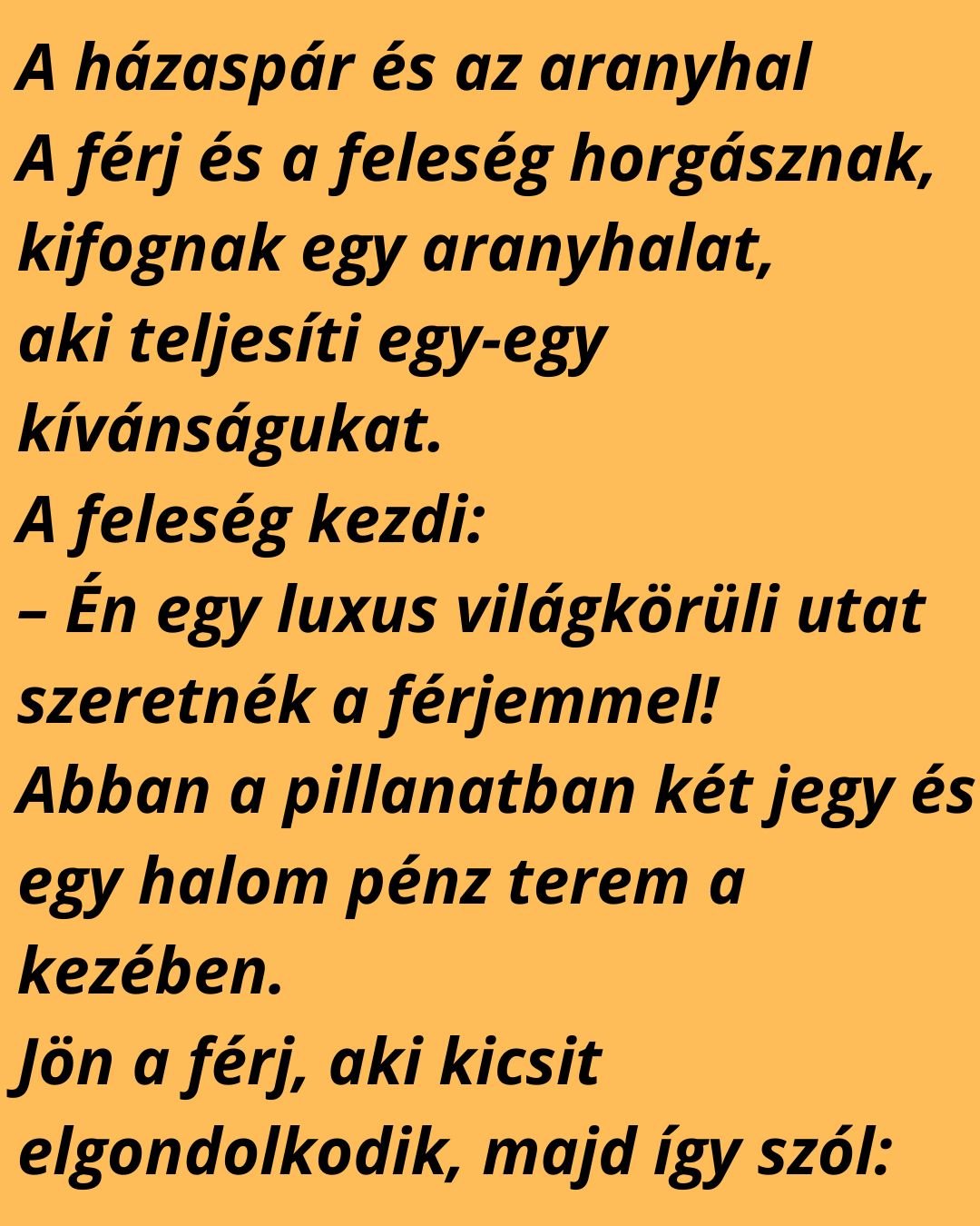 A férj és a feleség horgásznak, kifognak egy aranyhalat,