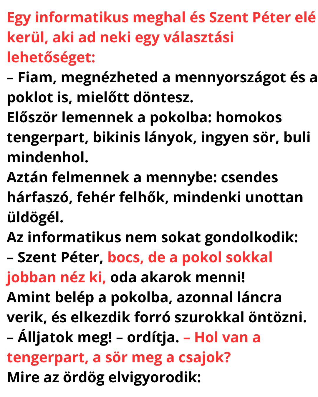 – Szent Péter, bocs, de a pokol sokkal jobban néz ki, oda akarok menni!