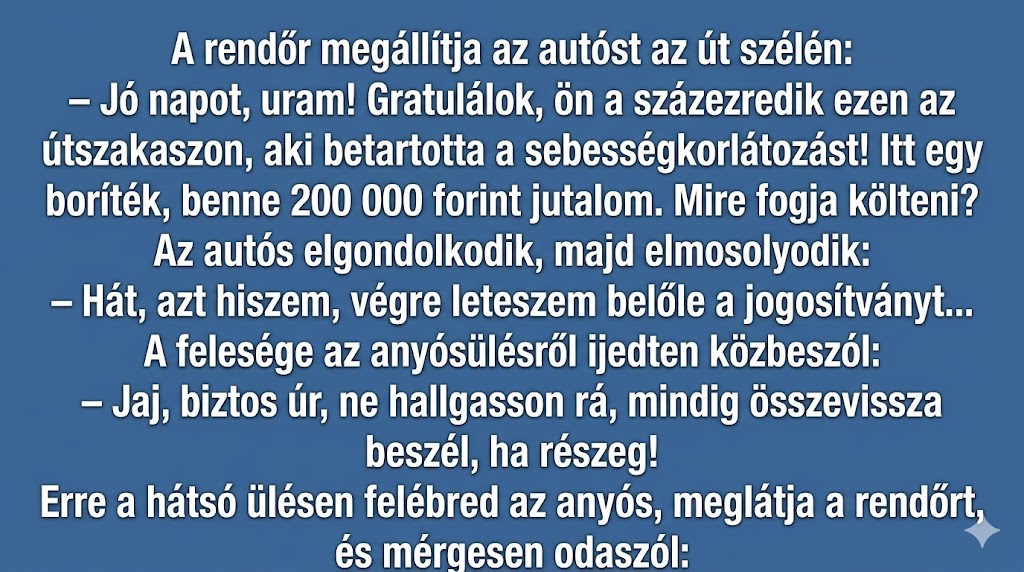 – Jó napot, uram! Gratulálok, ön a százezredik ezen az útszakaszon, aki betartotta a sebességkorlátozást! Itt egy boríték, benne 200 000 forint jutalom. Mire fogja költeni?