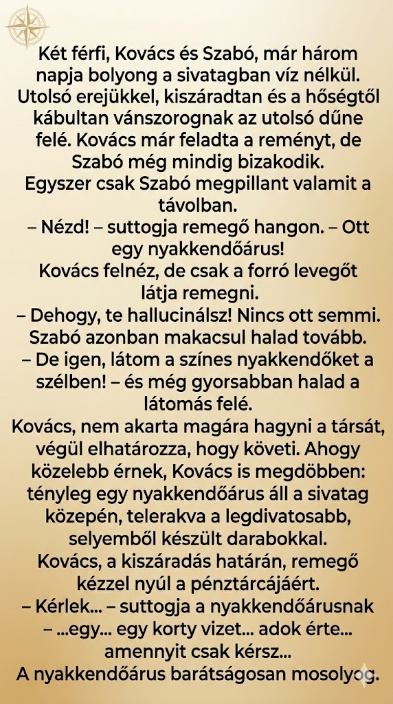 Kovács, utolsó erejével, hálásan biccent, és Szabóval együtt elindul a megadott irányba. Újabb fél óra vánszorgás után, amikor már tényleg azt hiszik, hogy nem bírják tovább, megpillantanak egy pazar, modern, üvegből és fémből épült épületet a dűnék között. A felirat világít: „A Sivatagi Oázis – Luxus Étterem”.