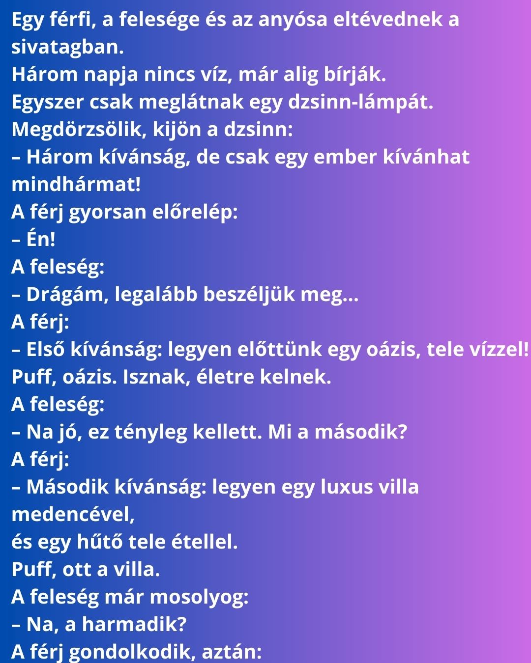 – Három kívánság, de csak egy ember kívánhat mindhármat!