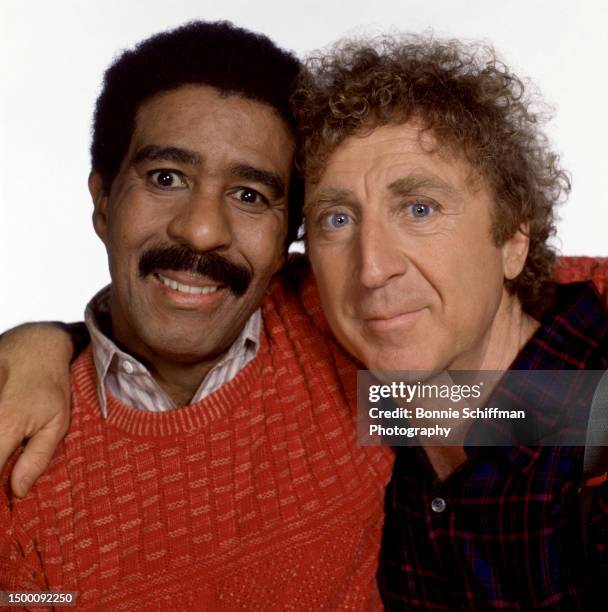 American comedians Richard Pryor (1940 – 2005) and Gene Wilder (1933 – 2016) embrace with their faces pressed together in Los Angeles, California, circa 1989. (Photo by Bonnie Schiffman/Getty Images)